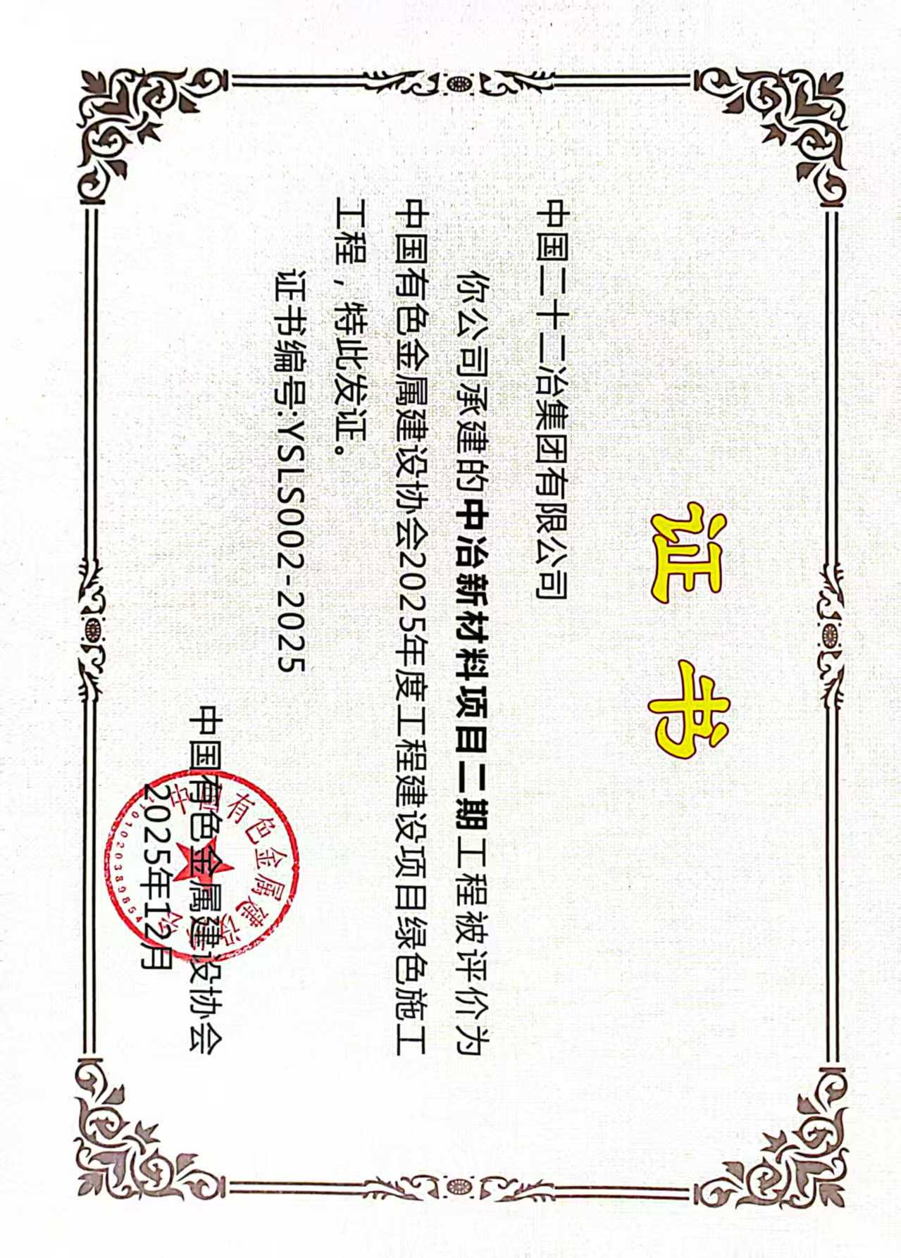 近日獲悉,華北公司中冶新材料二期項(xiàng)目被評(píng)為中國(guó)有色金屬建設(shè)協(xié)會(huì)2025年度工程建設(shè)項(xiàng)目綠色施工工程。
