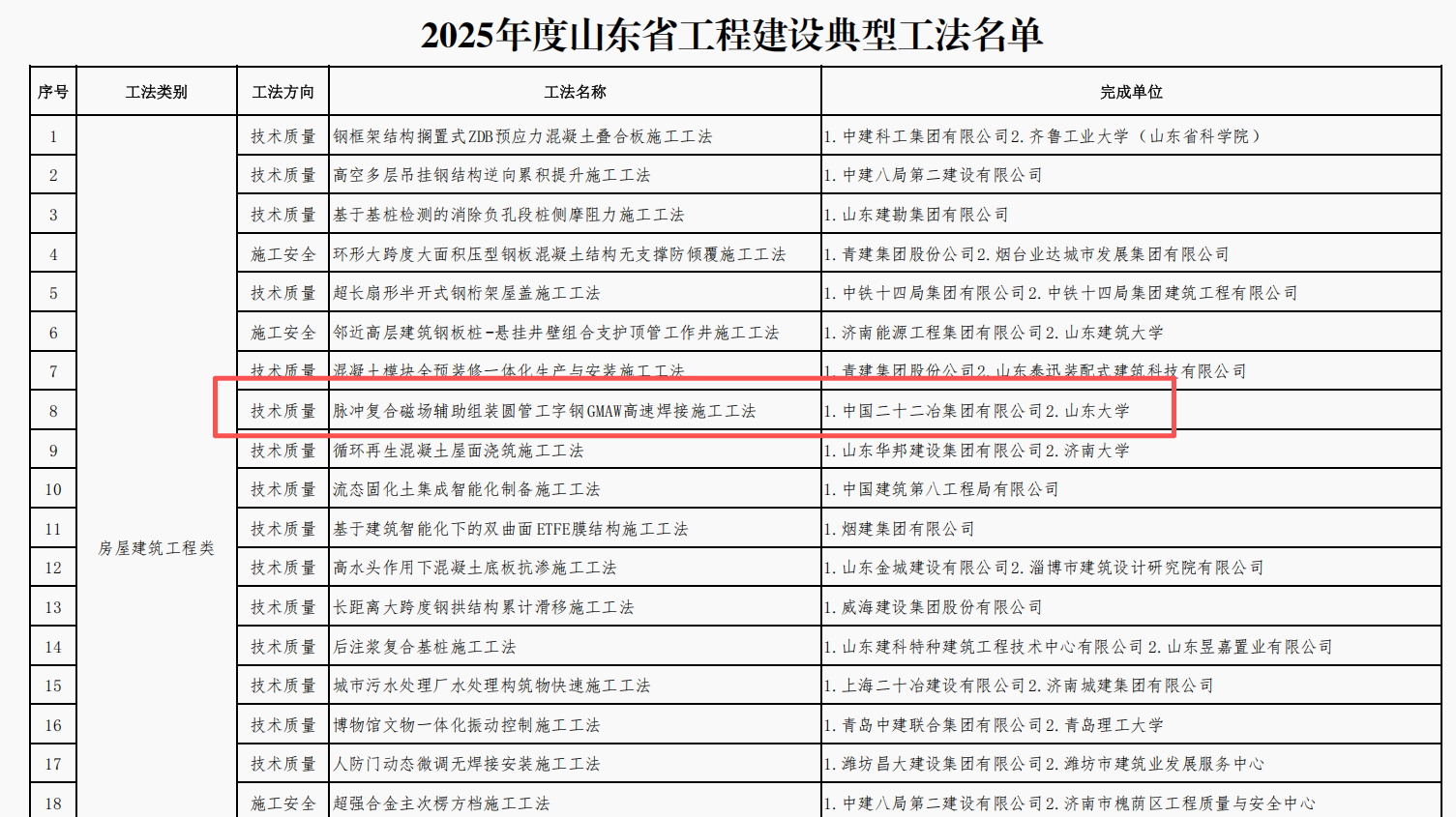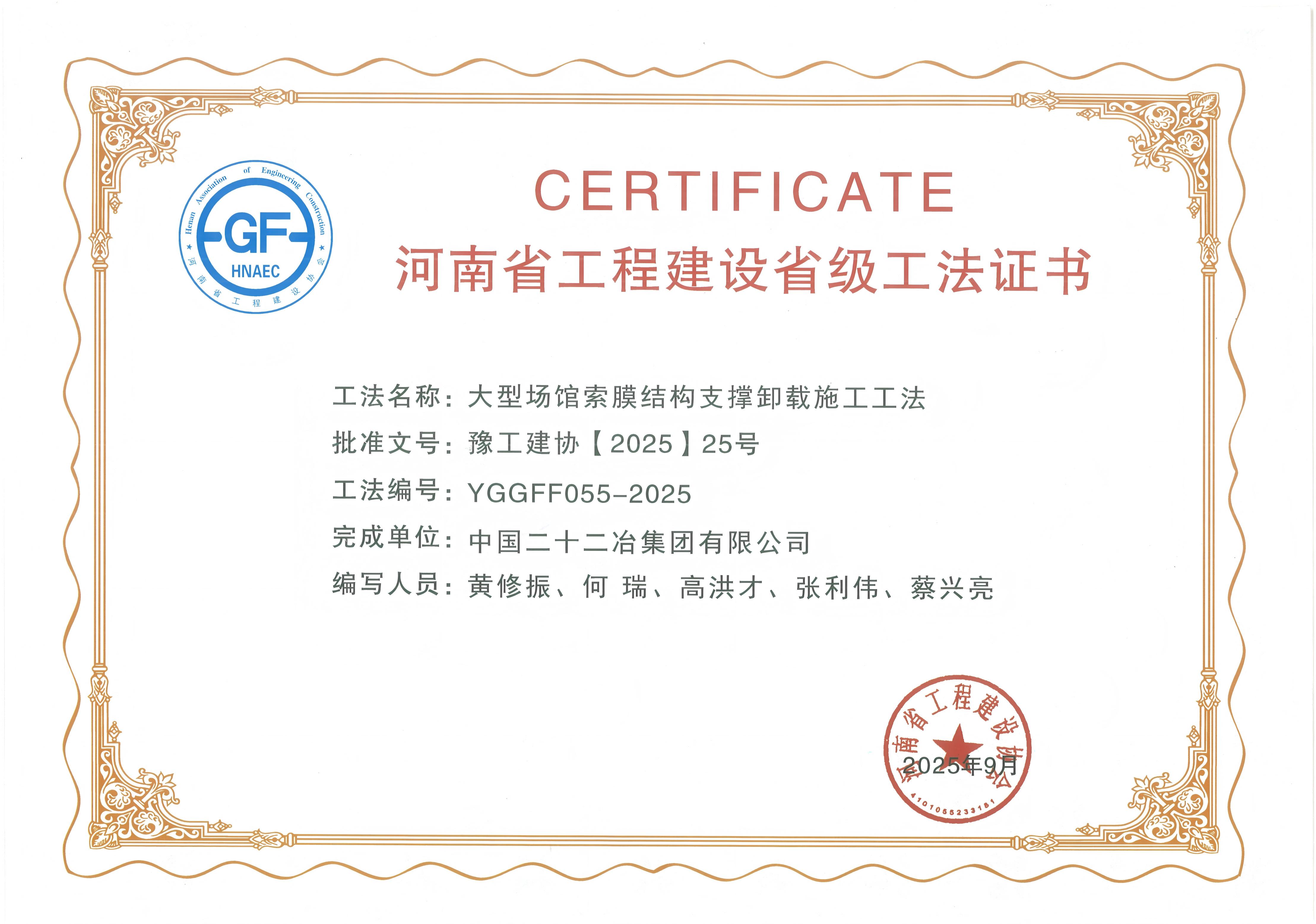 在山東省住房城鄉(xiāng)建設(shè)廳公布2025年度山東省工程建設(shè)工法名單,公司《脈沖復(fù)合磁場輔助組裝圓管工字鋼GMAW高速焊接施工工法》憑借技術(shù)創(chuàng)新性與實踐價值,獲評“山東省工程建設(shè)典型工法”;同期,河南省工程建設(shè)協(xié)會公布年度省級協(xié)會工法,公司《大型場館索膜結(jié)構(gòu)支撐卸載施工工法》《智能旋挖式預(yù)制管樁樁芯土高效清理施工工法》《大跨度拱肋橋梁安全高效建造施工工法》3項成果亦成功入選該省級協(xié)會工法名單。