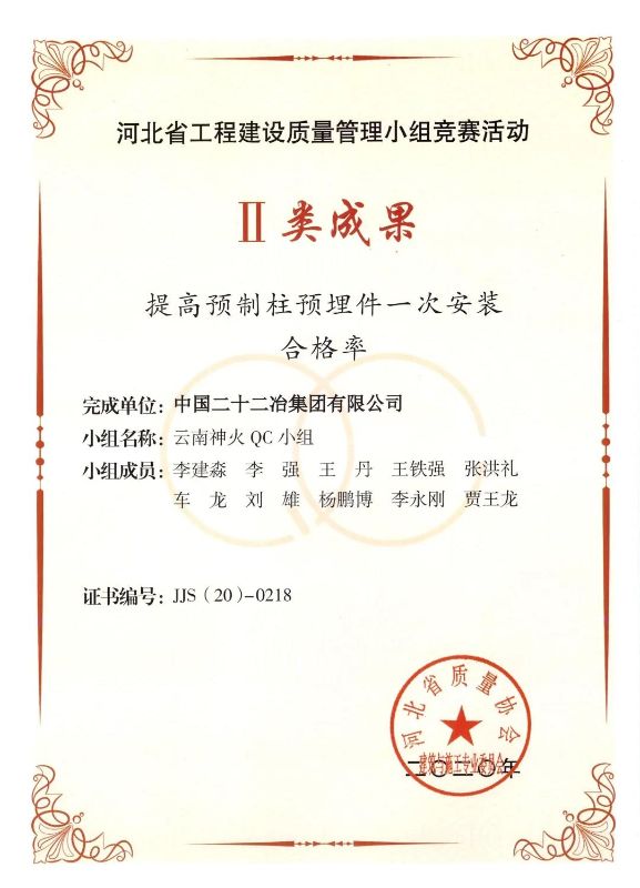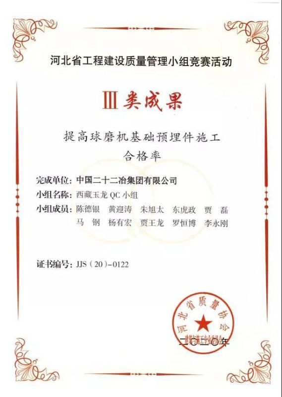 西北公司質(zhì)量管理工作再添碩果。日前,河北省質(zhì)量協(xié)會建筑與施工委員會公布了2020年度河北省工程建設(shè)質(zhì)量管理小組競賽活動成果的名單。公司報(bào)送的《提高預(yù)制柱預(yù)埋件一次安裝合格率》和《提高球磨機(jī)基礎(chǔ)預(yù)埋件施工合格率》兩項(xiàng)課題,分別榮獲了河北省工程建設(shè)質(zhì)量管理小組競賽活動Ⅱ類成果和Ⅲ類成果。